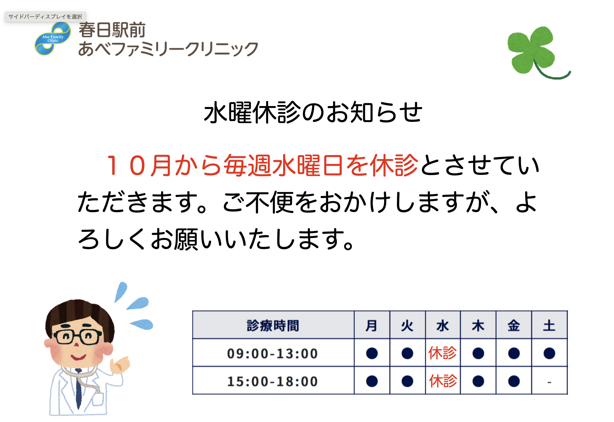 10月から毎週水曜日は休診いたします🏥 2023/8/19(土) 10月から、毎週水曜日を午前・午後とも休診とさせていただきます。 その他の曜日については、診療時間に変更ありません。水曜日に来院されていた患者さまにはご不便をおかけいたしますが、どうぞよろしくお願いいたします。 10月からの診療時間