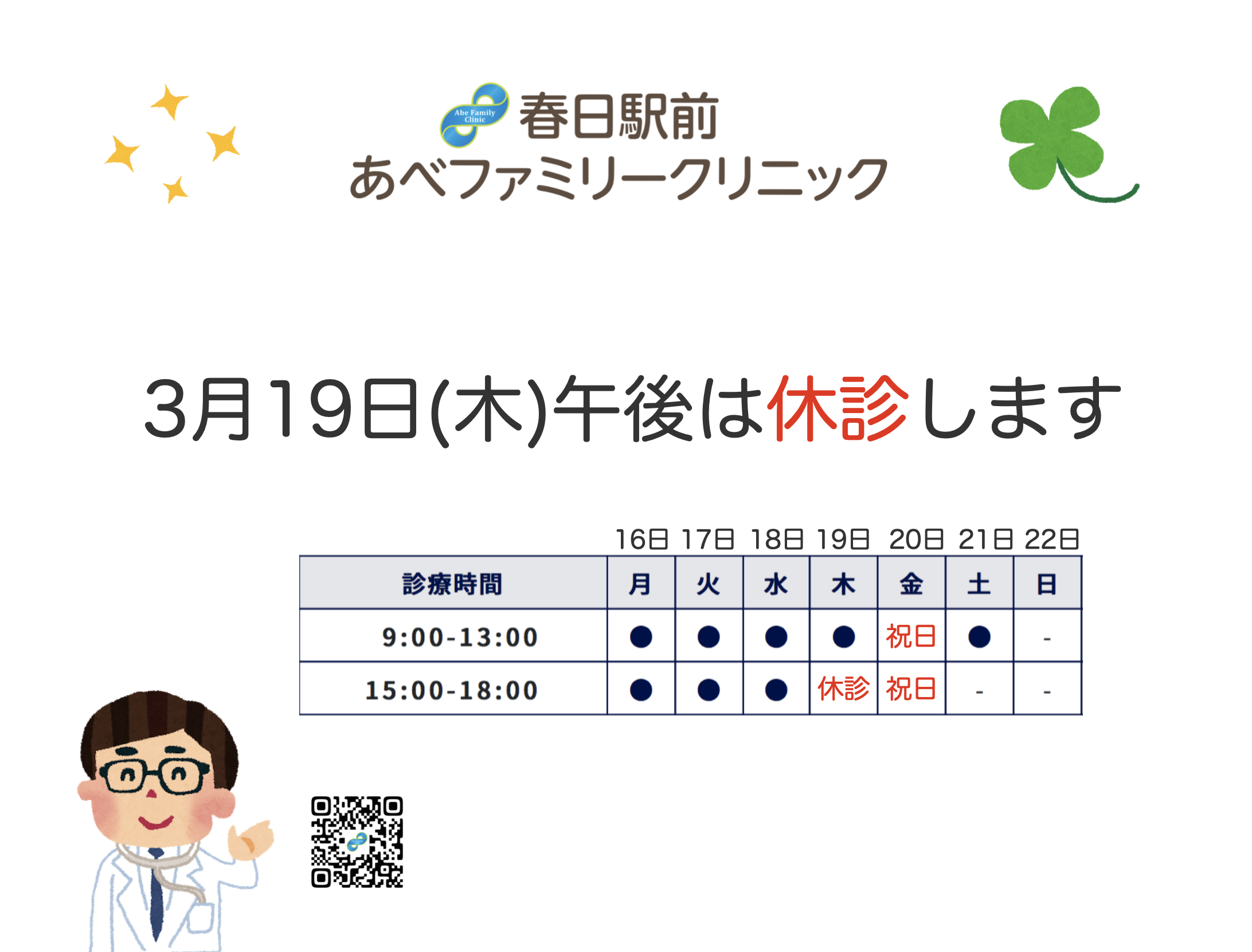 3月19日(木)午後は休診します🏥 2026/2/24(火) 3月19日(木)午後(15-18時)は休診いたしますので、ご来院予定の方はご注意ください。 なお、3月19日(木)午前(9-13時)は通常通り診療いたします。
