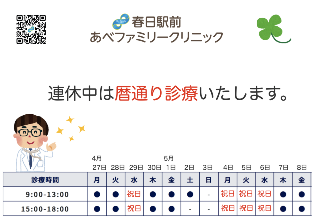 連休中は暦通りに診療いたします🏥 2026/4/15(水) 今年のゴールデンウィーク期間は、暦通りに診療いたします。 この期間中にお薬がなくなってしまう患者さんは、お気をつけください。来院が難しい場合は、オンライン診療もご利用いただけますのでご相談くださいね。