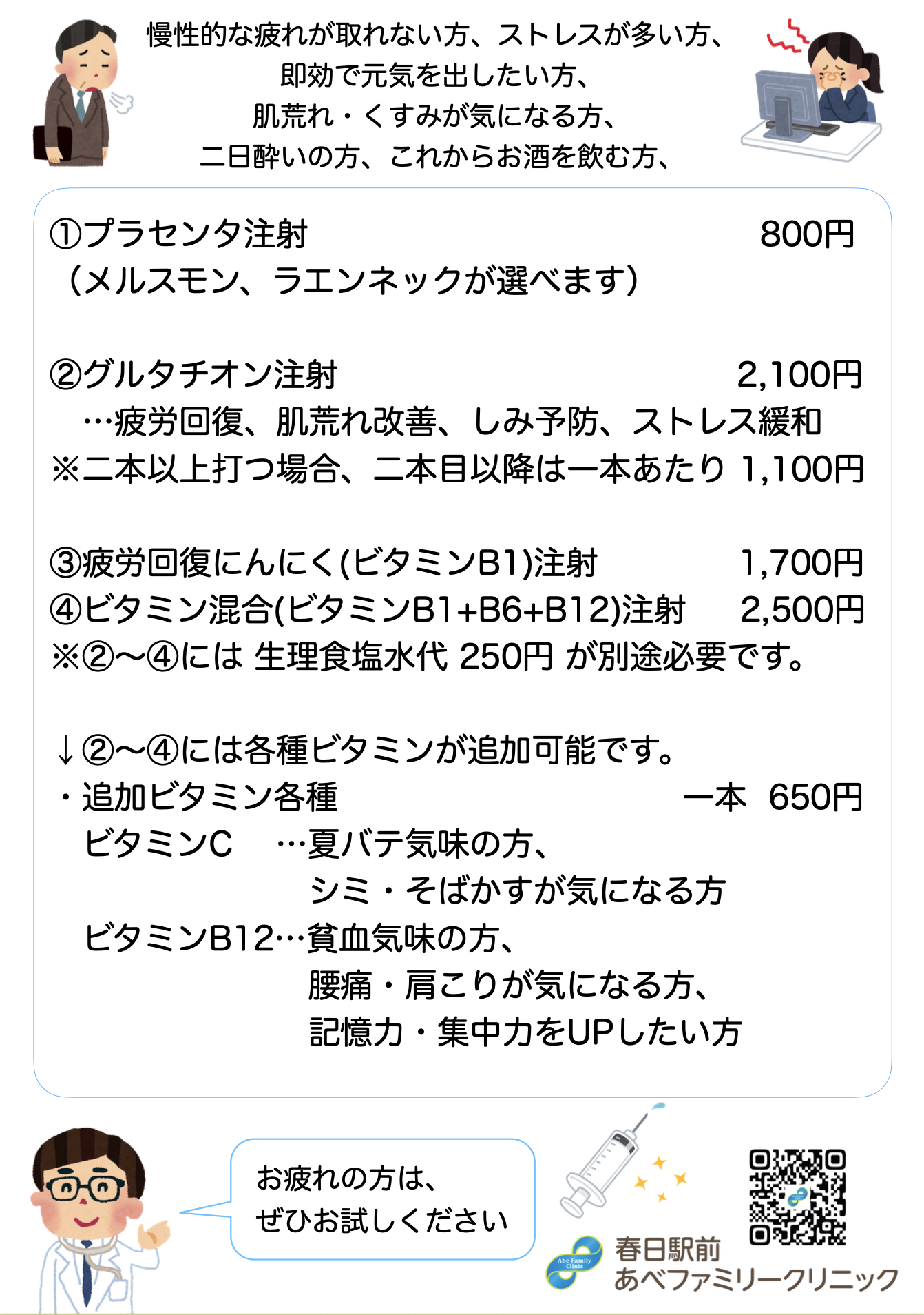 下記の症状がある方は是非お試し下さい。ただし、健康保険が使えませんので自費診療になります。ビタミンB1配合のにんにく注射が基本ですが、プラセンタや各種ビタミン、グルタチオンを追加することができます。お気軽に医師にご相談下さい。